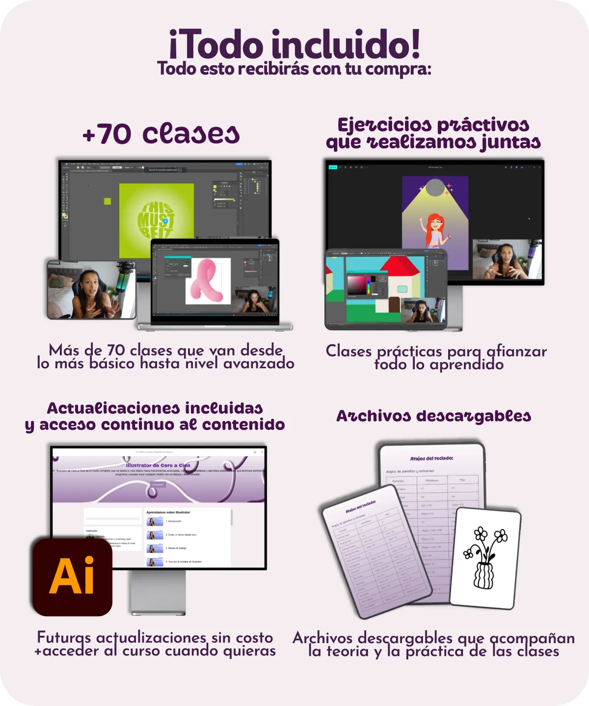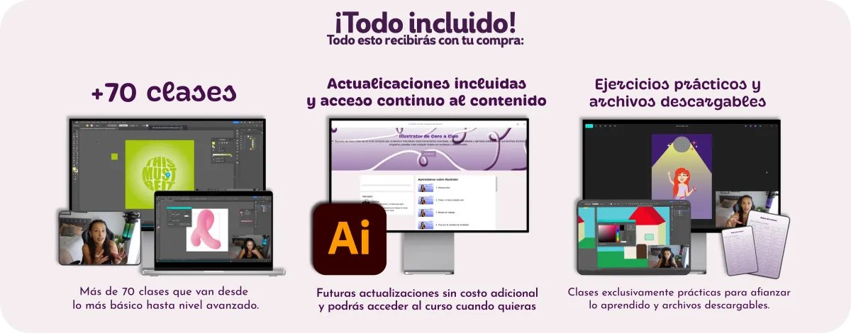 Tendrás acceso de por vida al curso, con futuras actualizaciones para mantenerte siempre al día con las nuevas herramientas y tendencias de Illustrator.
