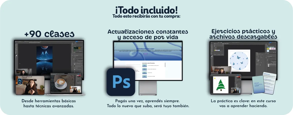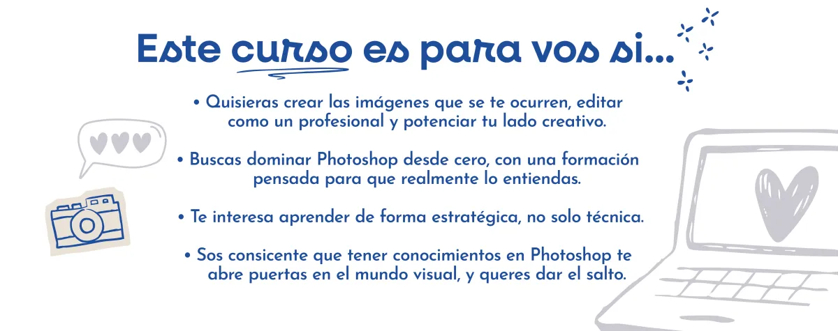 Para apasionados del arte y el diseño que estén listos para aprender a manejar Photoshop por completo y poder llevar su imaginación a proyectos tangibles, generando diseños y composiciones fotográficas que los diferencien del resto.
